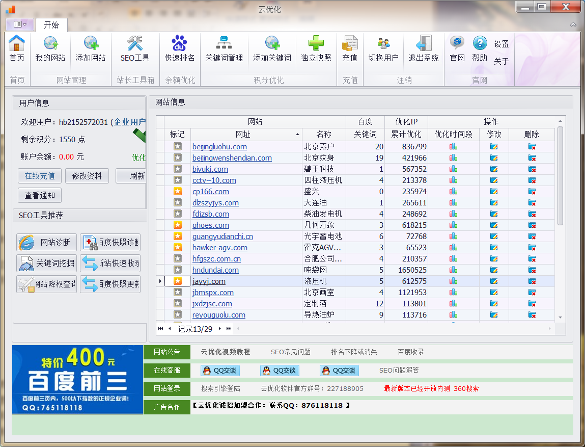 优化过程:做好站内优化,站外优化,坚持更新文章,发布外链,做好友链的检查工作。配合北京云无限科技有限公司开发的的优化软件软件:云营销(软件下载地址http://www.soupv.com )。