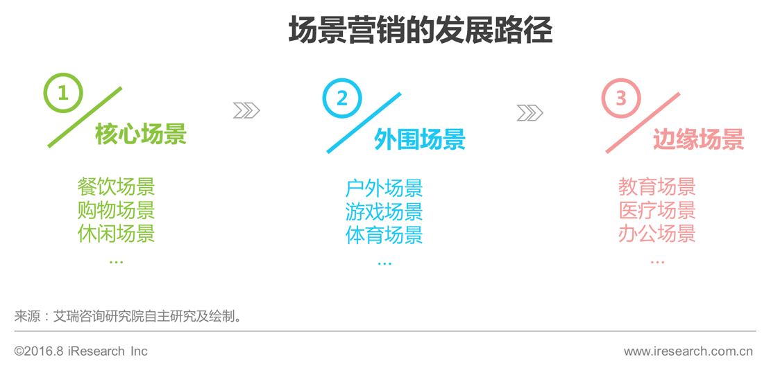 按照用户、基础设施、线下商家三大要素的完善程度,可将细分场景分为核心场景、外围场景和边缘场景,核心场景中用户流量更加充足、基础设施较为完备、线下商家的营销意识也更强烈,餐饮、购物、休闲、出行等场景属于核心场景,场景营销将会沿着核心场景——外围场景——边缘场景的路径依次发展。