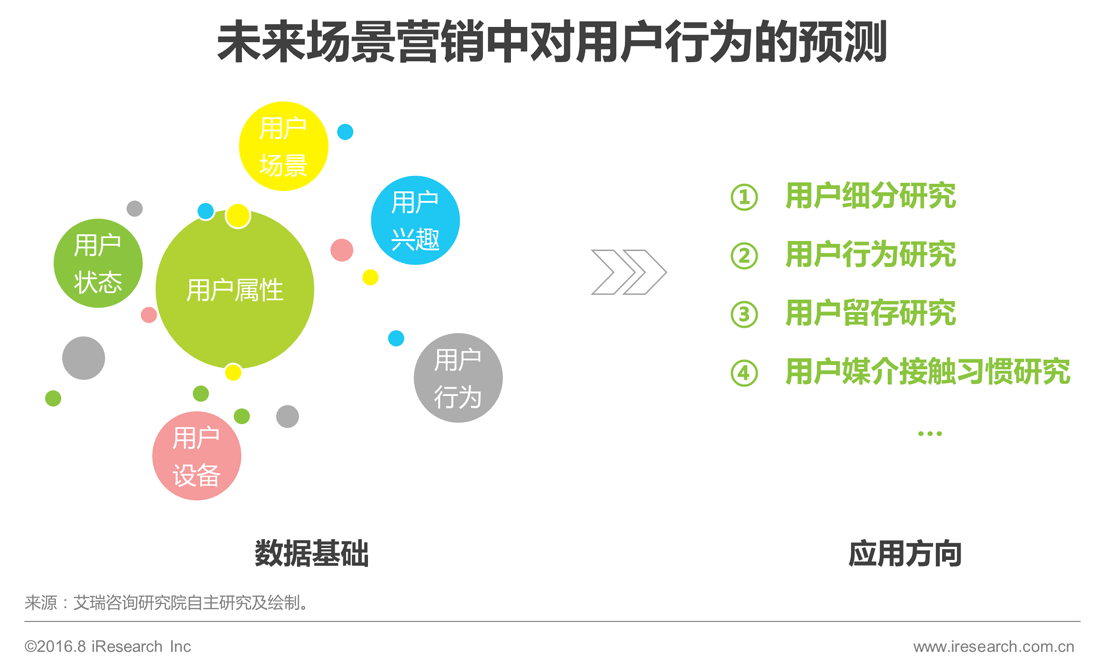 巴拉巴西(Albert-LaszloBarabasi)在《爆发》一书中提出人类行为93%是可以预测的。未来,人类将处在大数据时代,智能手机及各种传感器将人类的一举一动、一言一行都记录、存储,人类生活的社会将变成一个巨大的数据库,技术的发展为预测人类行为提供了可能。场景营销发展的核心便在于预测用户行为,用户每时每刻产生的数据,都被场景营销产业链中各环节上的企业用于用户细分研究、用户行为研究、用户留存研究、用户媒介接触习惯研究等,从而更好地服务营销行为,提升营销效率。