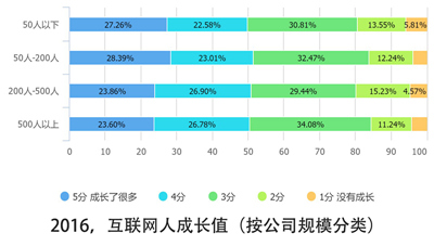 从个人成长来看,50人-200人的中型公司的互联网人感觉自己成长最快,幸福指数最高。