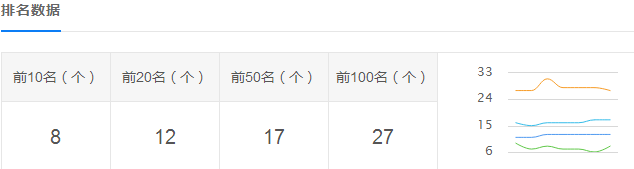 这个统计的是本站有指数的关键词前100名排名情况。由此可见网站的关键词数量还是不少的,虽然客户只做了三个关键词,但是整站优化带来的效益是很明显的。
